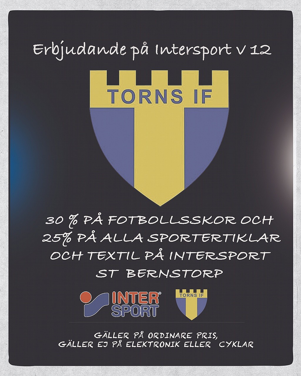 OBS!! Koppla din Intersport profil till Torns IF under ”Mina sidor” på intersport.se. Då får både du och din förening extra bonus när du handlar allt från fotbollsskor och hockeyklubbor till regnkläder, sneakers och sportmode på Intersport.