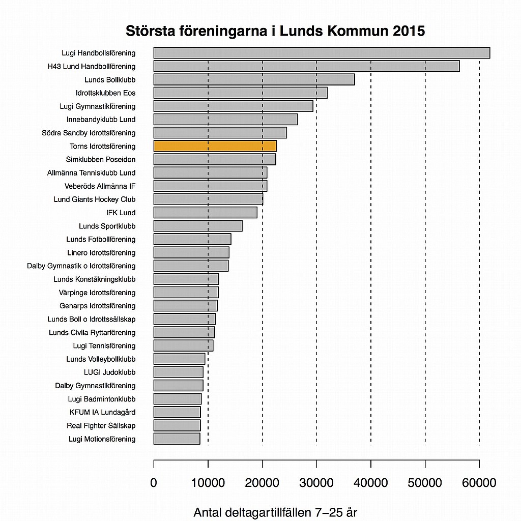 2014 då vi redovisade 21838 deltagartillfällen. Torns IF var under 2015 den åttonde största idrottsföreningen i Lunds kommun. Totalt erhöll 111 föreningar i Lunds kommun aktivitetsstöd från RF för 2015.