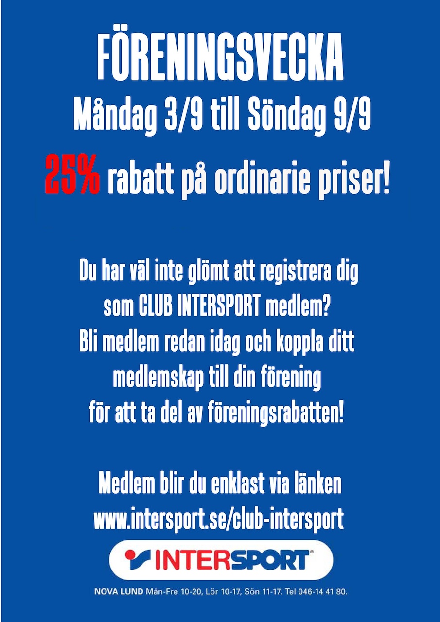 Intersportbutiken på Nova Lund. För att ta del av föreningsrabatten så skaffa Club Intersport-konto och koppla ert konto till Torns IF genom att ange Torns IF som "Min