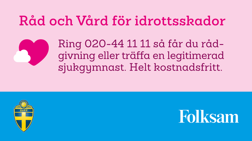 Sedan tidigare är aktiva fotbollsspelare försäkrade hos Folksam genom Svenska Fotbollsförbundet (SvFF). I försäkringen ingår nu gratistjänsten råd och vård för idrottsskador. Om du blir skadad vid träning eller