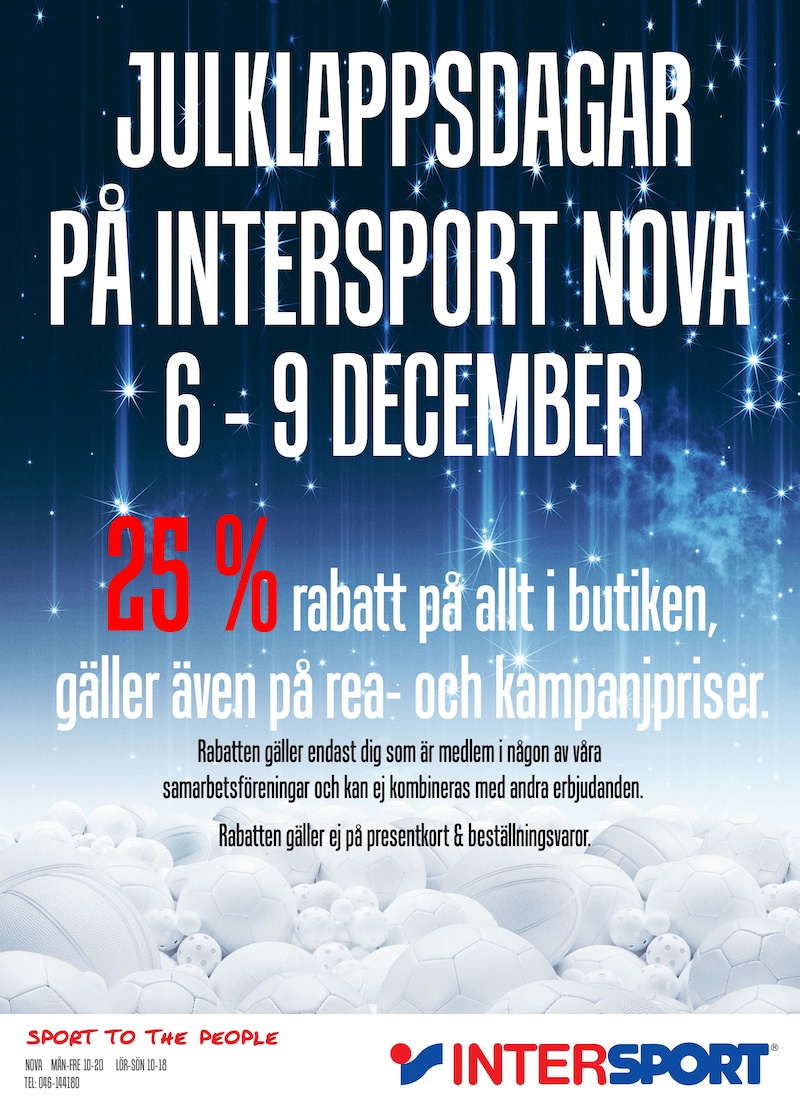 Torsdag 6/12 till söndag 9/12 är det julklappsdagar på Intersport Nova.