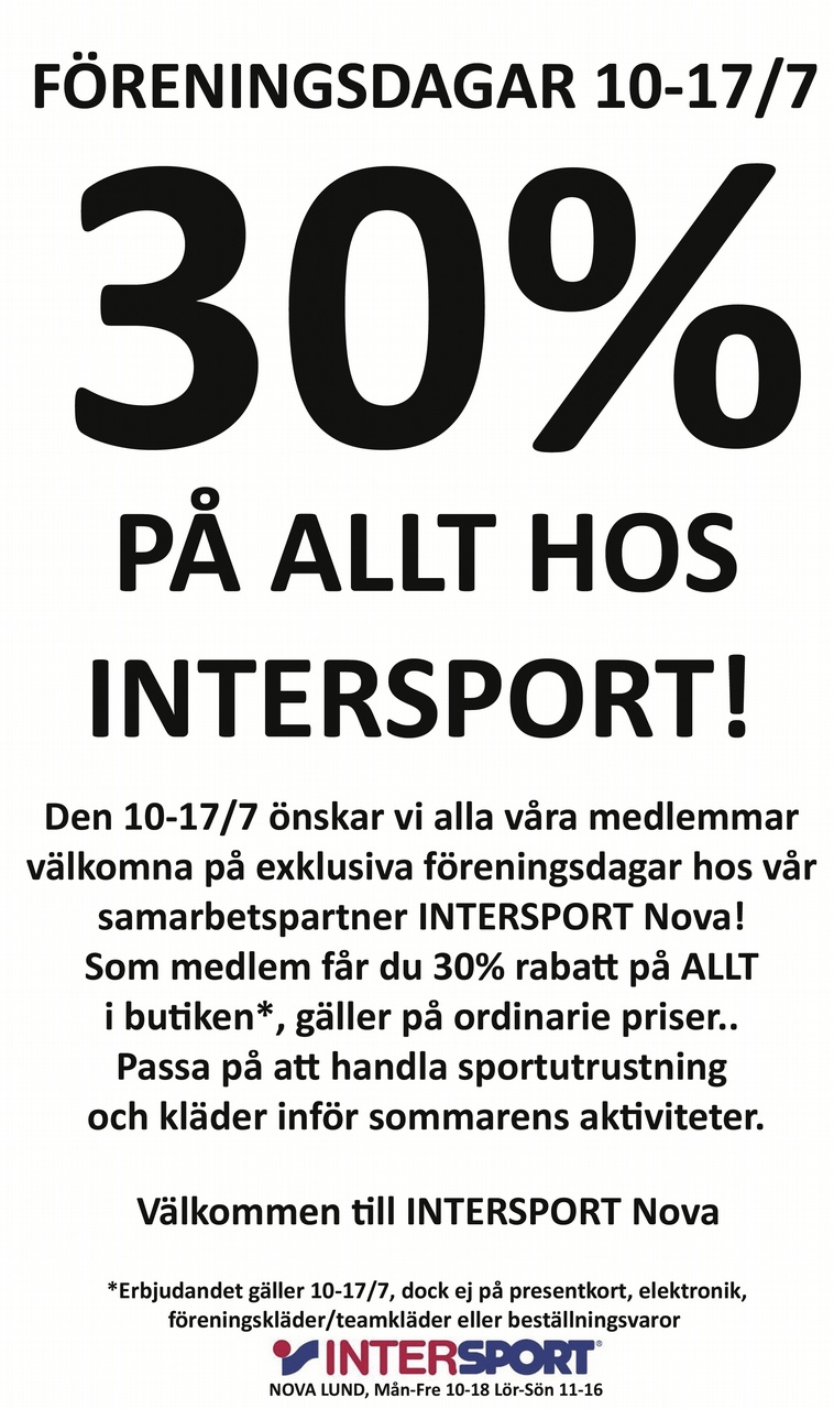 Nu på fredag börjar en veckas föreningsdagar hos vår samarbetspartner Intersport Nova Lund. Som medlem har du då 30% på allt i butiken (gäller på ordinarie priser).