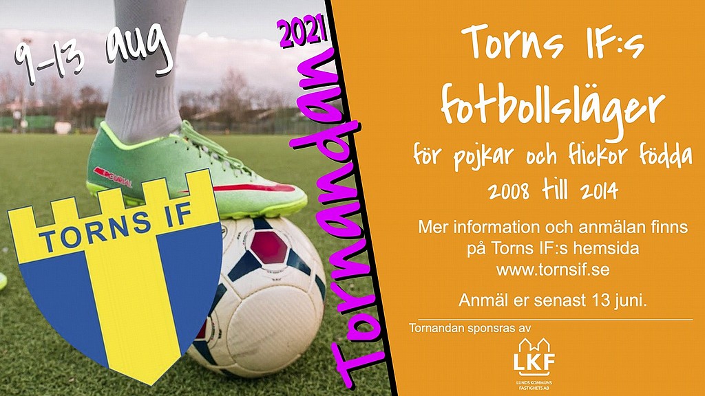 Missa inte att anmäla dig till vårt fotbollsläger Tornandan som i år är för pojkar och flickor födda 2008 till 2014 och går av stapeln den 9-13 augusti.
