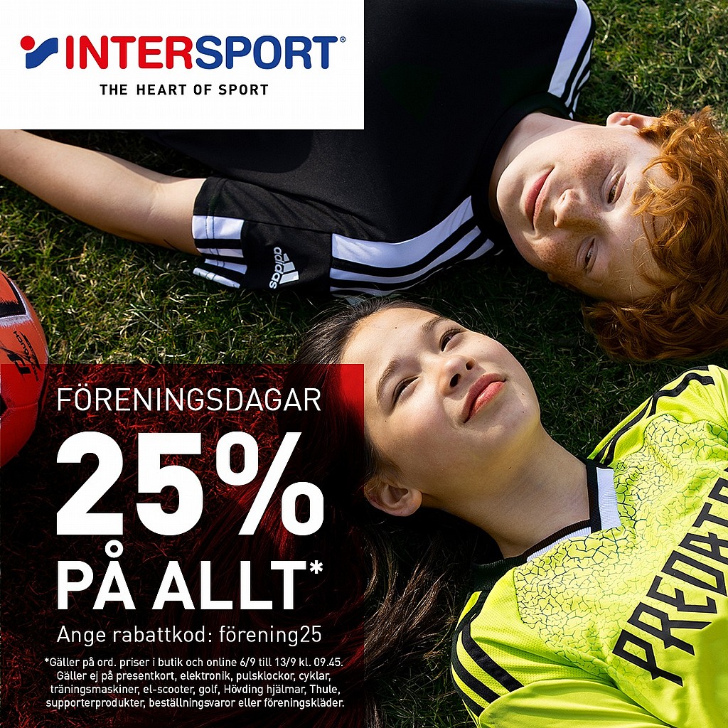 Nu har vår samarbetspartner Intersport 25% på allt i butik och på intersport.se, ett perfekt läge att köpa det ni behöver för en aktiv höst. Gäller på ord. priser i butik och online 6/9 till 13/9 kl. 09.45.