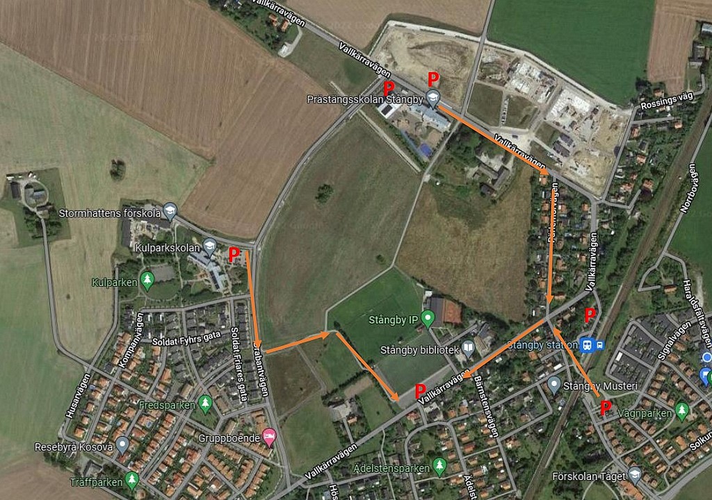 Parkeringsmöjligheterna är begränsade runt Stångby IP. Välj gärna tåg, buss eller cykel som färdmedel. Om ni ändå behöver ta bilen finns det i kartan utmärkt med P var man kan parkera.