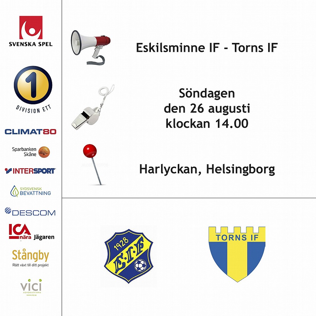 Imorgon söndag spelar Torns IF match i den 19:e omgången av Division 1 Södra. Torns IF möter Eskilsminne IF på bortaplan på Harlyckans IP i Helsingborg med avspark kl. 14:00.
