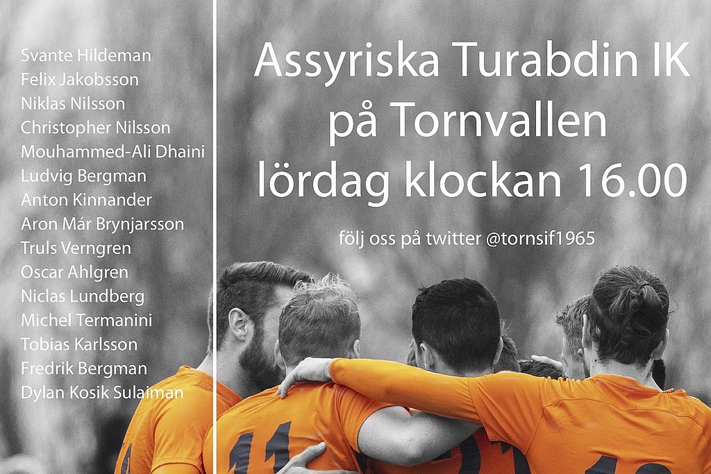 Imorgon lördag 8 juni är det match i Division 1 Södra på Tornvallen igen. Vi gästas av Assyriska Turabdin IK. Avspark kl 16. Välkomna!