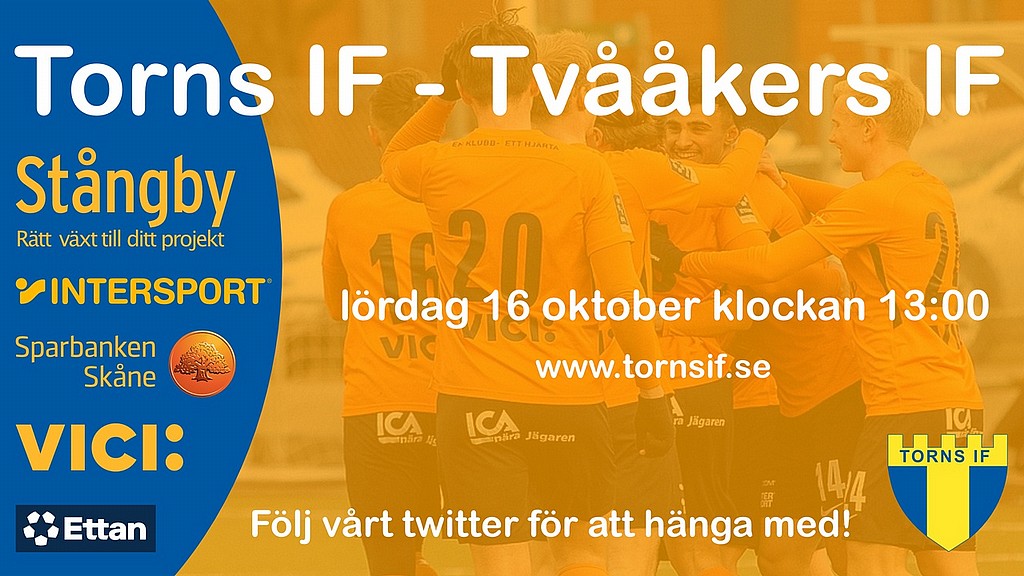 Vi har kommit fram till den 25:e omgången av årets Ettan Södra. Torn ligger efter förra helgens matcher elva i tabellen med två poäng ner till nedflyttningsplats. Spänningen fortsätter alltså och vi hoppas ni tar er till Stångby både till matchen mot Tvååker och under resten av säsongens hemmamatcher för att stötta Torn.