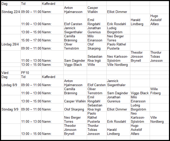Nu har Camilla (Sixtens mamma) hjälps oss genom att ta fram vårens schema för att bemanna cafeterian (se bifogad bild).